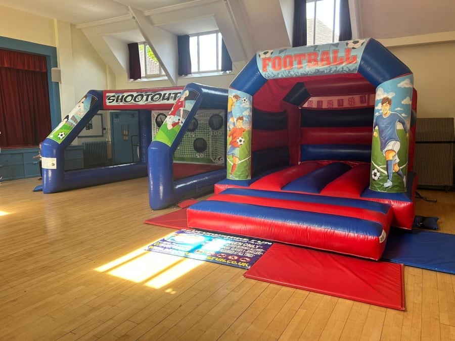 • 1 x (15 x 11) Football bouncy castle • 1 x Penalty shootout • 3 x Footballs (soft foam indoor & normal for outdoor) • 2 x inflatable fans • 2 x 25m extension leads • 2 x sets of anchorage for indoors or outside • 2 x safety crash mats